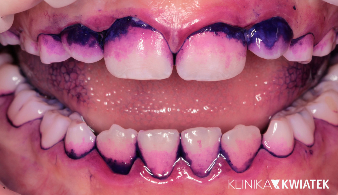 Po rozmowie z małym Pacjentem, wykonano wybarwienie płytki nazębnej, które dosłownie „pokazało” problem – niedokładne szczotkowanie, brak nitkowania, biofilm w przestrzeniach międzyzębowych i wzdłuż linii dziąseł. Widoczne ciemniejsze obszary to miejsca, w których bakterie utrzymywały się najdłużej, zwiększając ryzyko stanu zapalnego